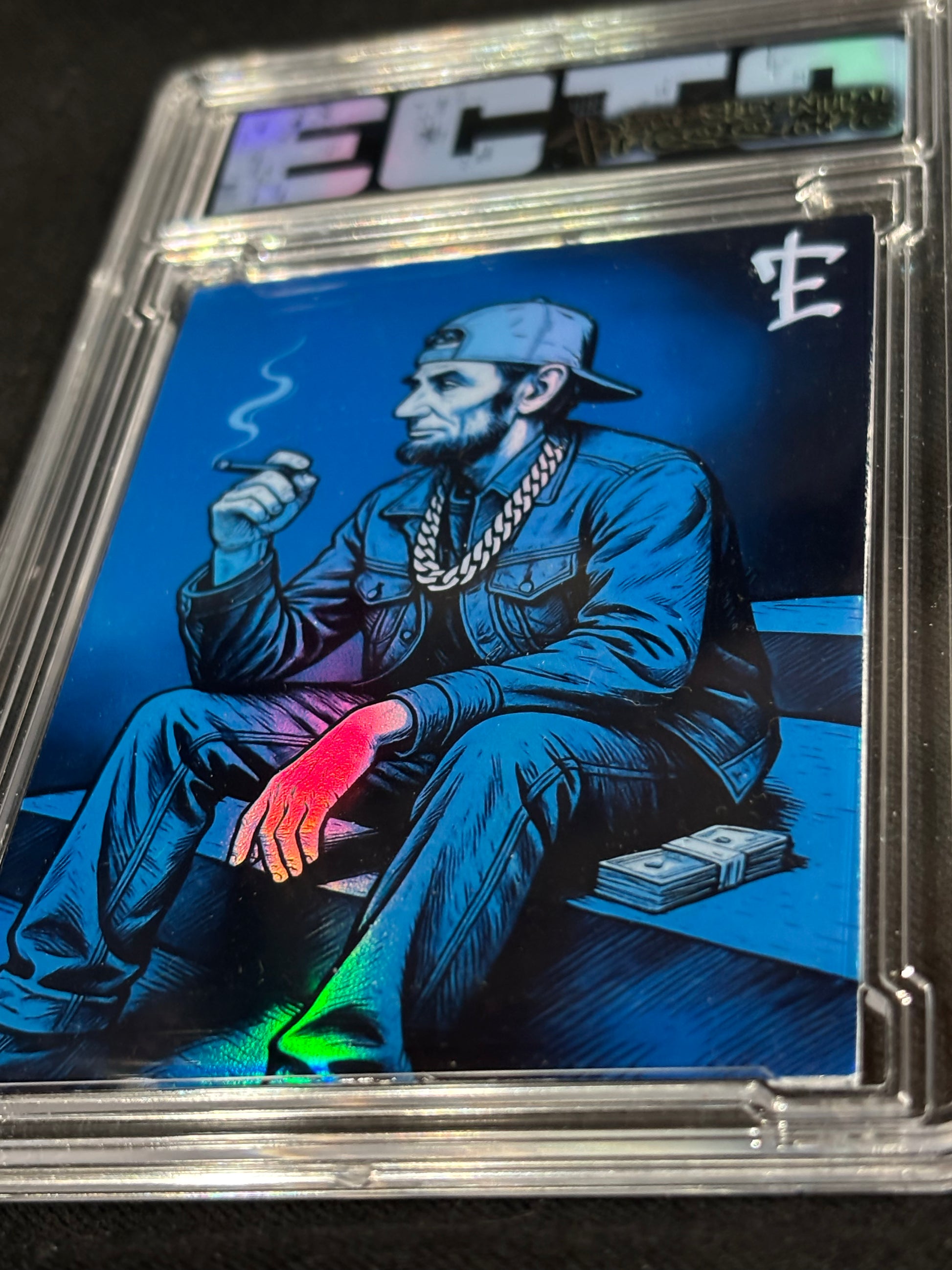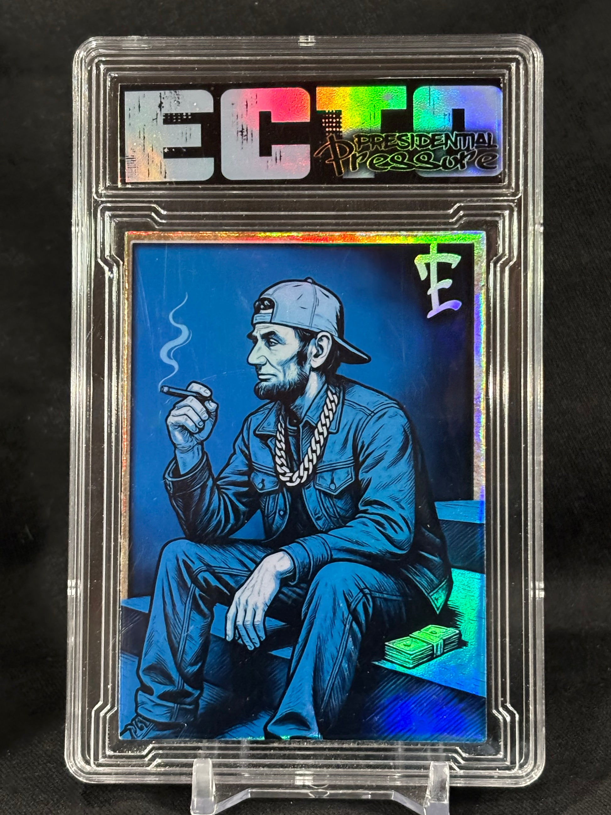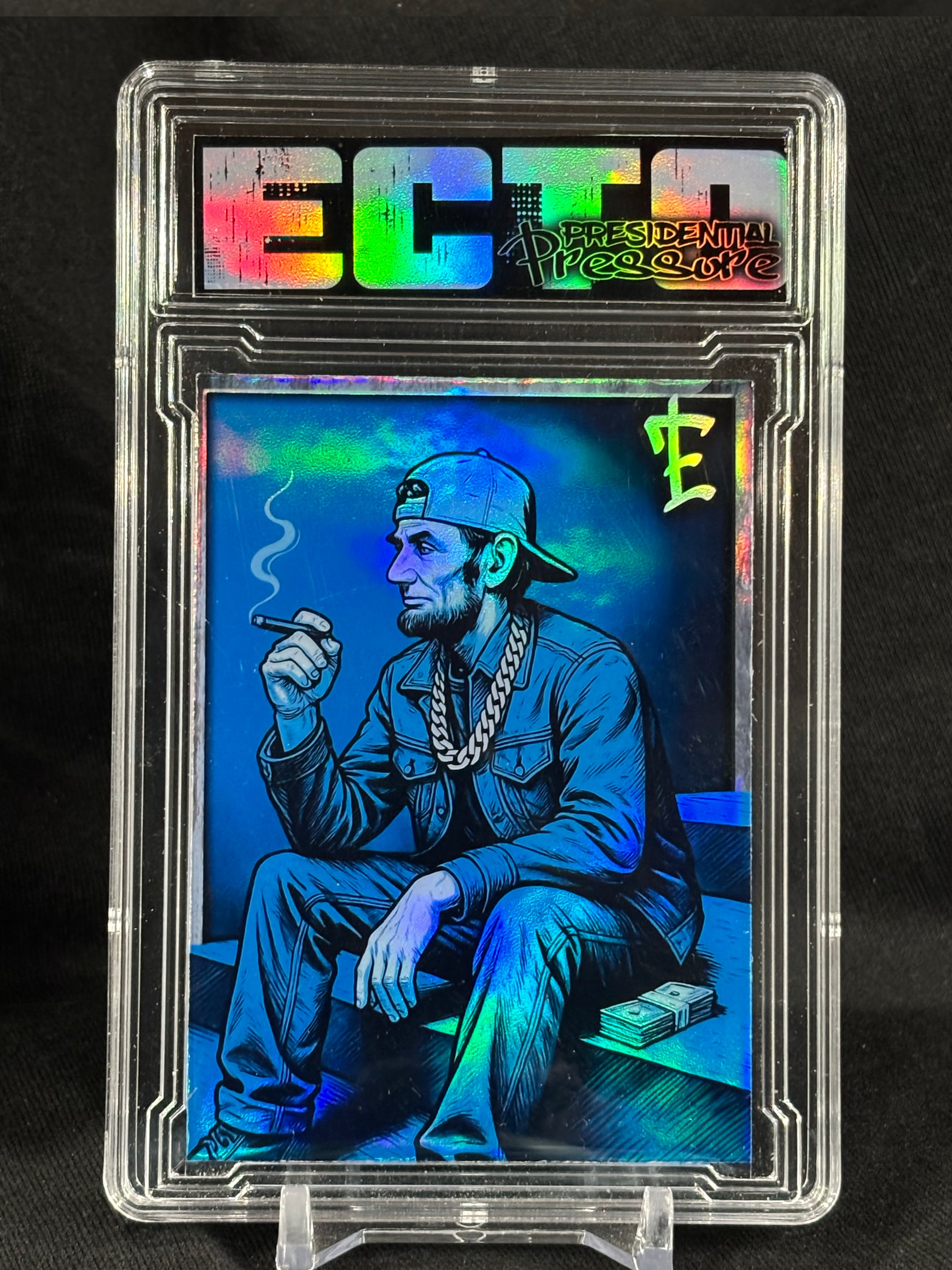 Lincoln posted up in streetwear, chain on, stack of cash beside him — a mash-up of Americana, hip-hop attitude, and neon foil chaos.