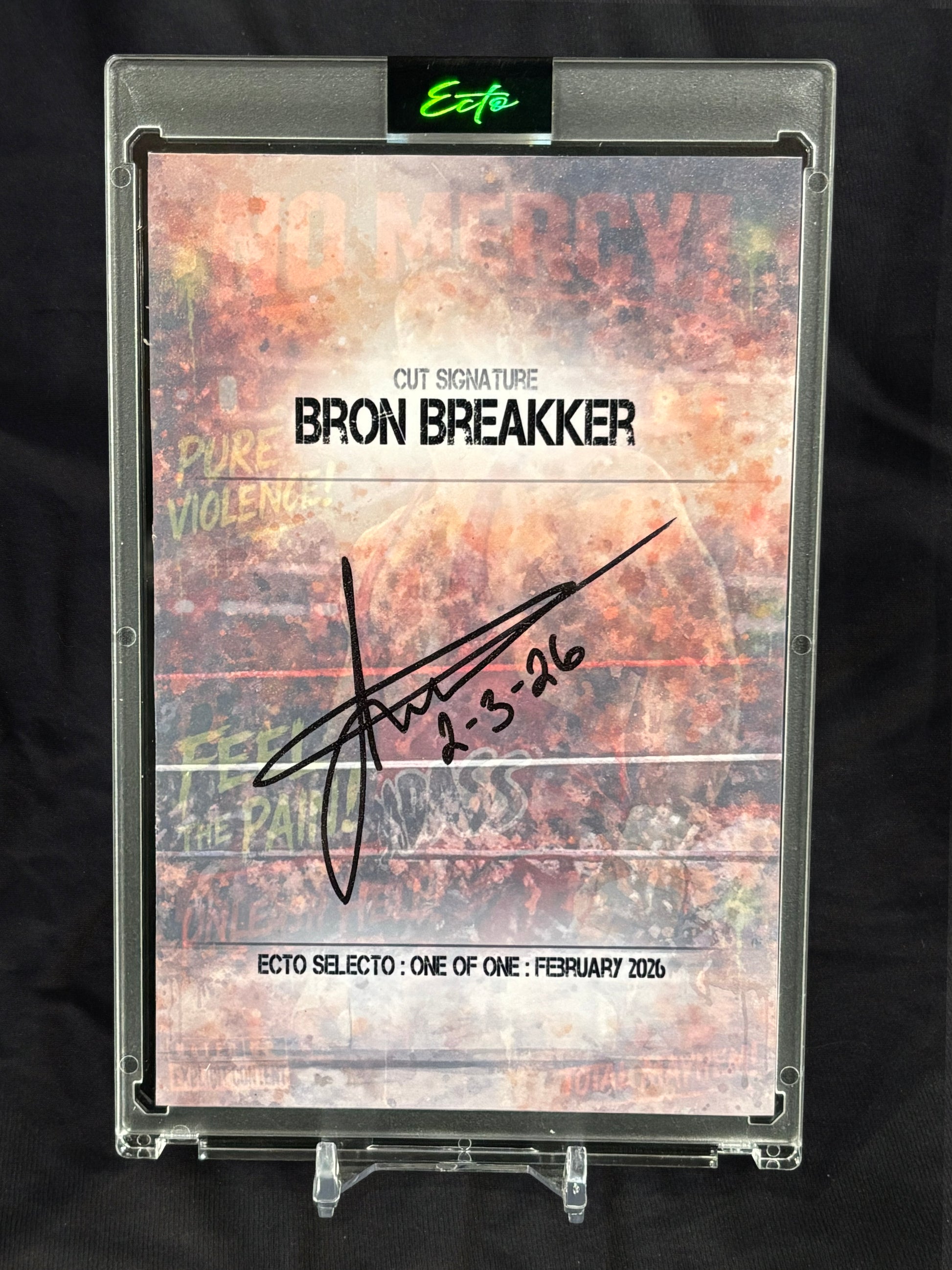 This is a one-of-one (1/1) art-forward cut signature of WWE powerhouse Bron Breakker, presented in a custom-designed 4x6 archival display format by Ecto Selecto.