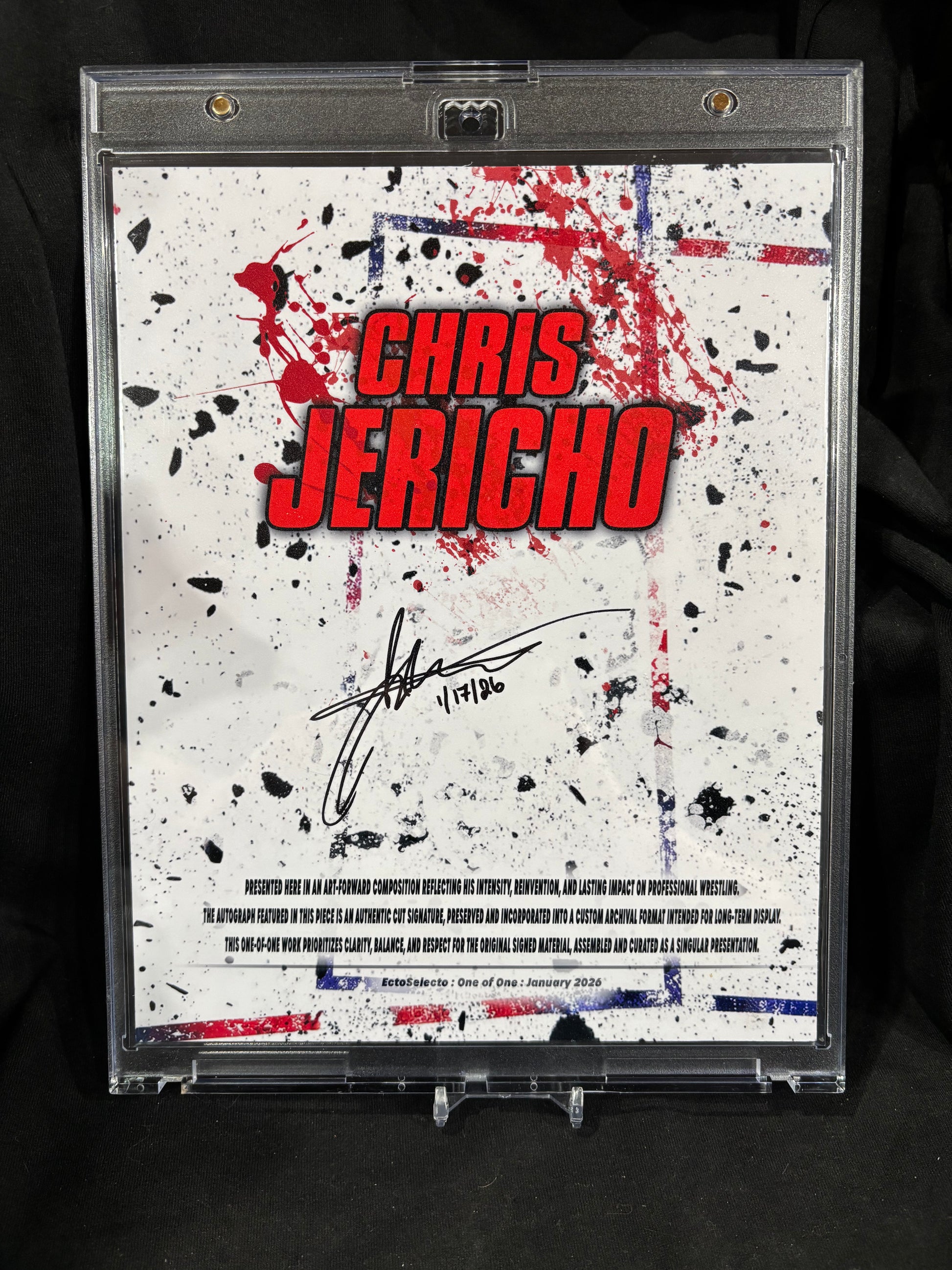 The front artwork draws from Jericho’s explosive in-ring persona, blending distressed textures, bold contrast, and controlled chaos. The composition is designed to complement the signature rather than compete with it, allowing the autograph to remain the focal artifact.