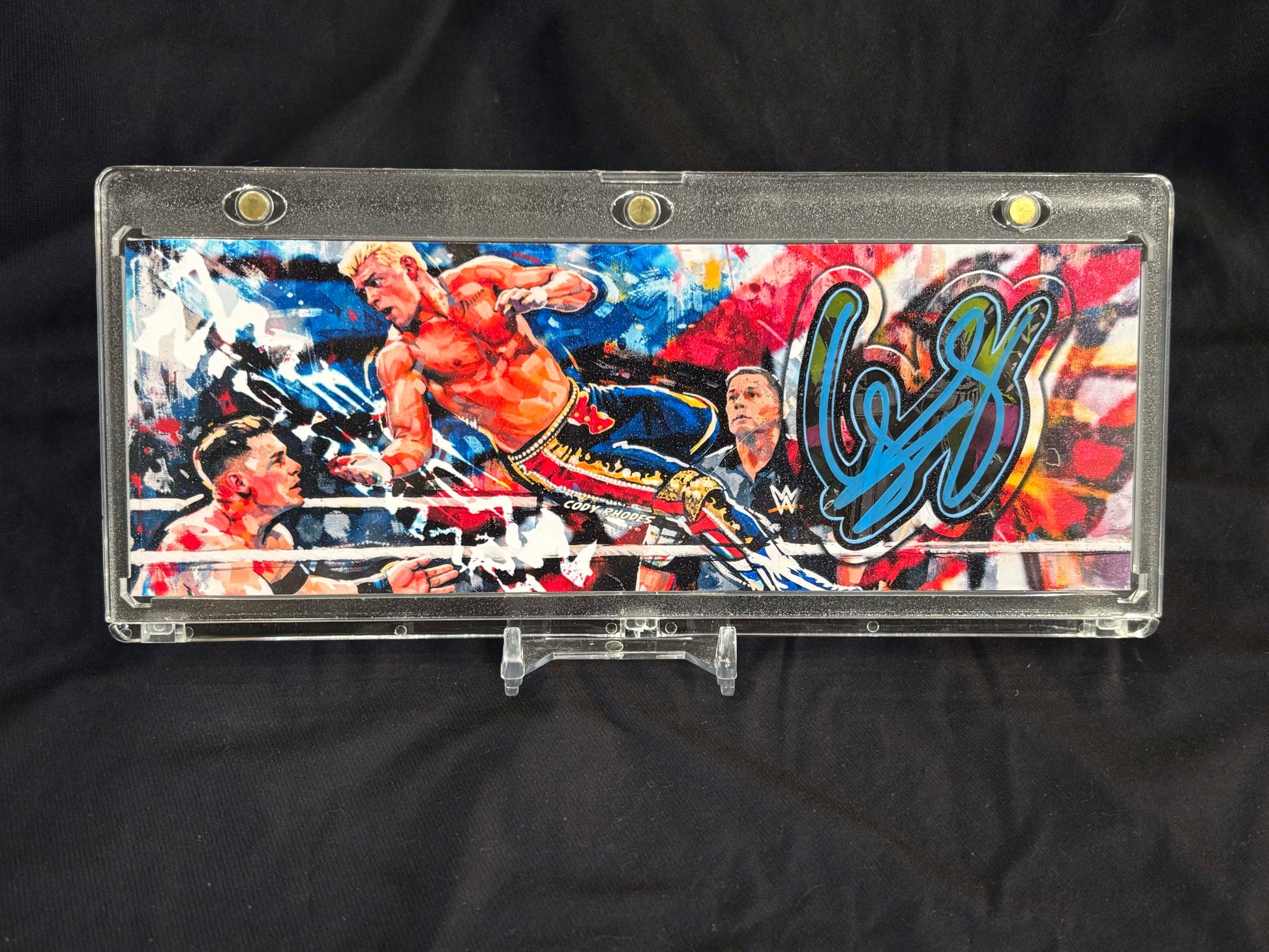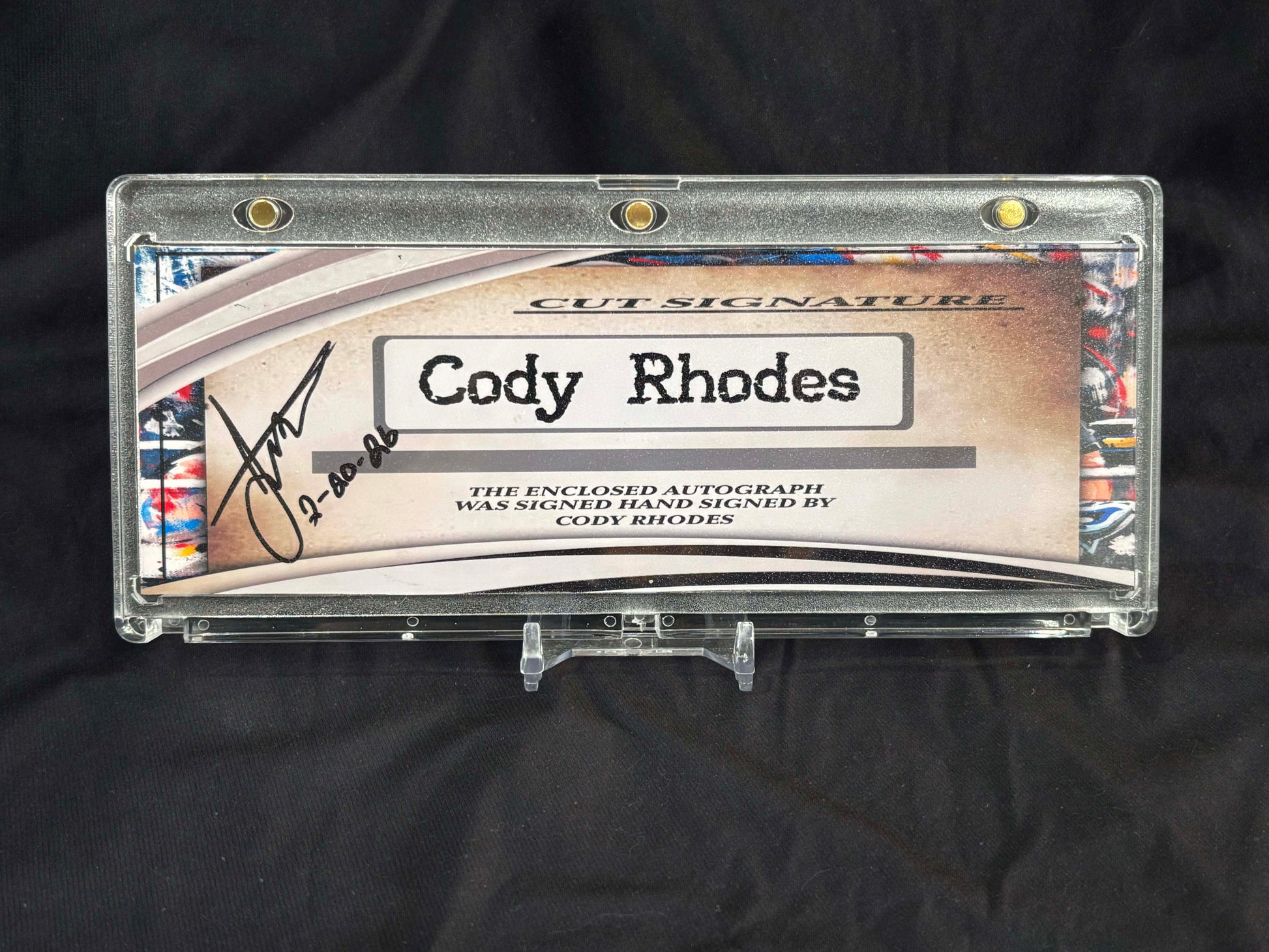 A one-of-one art-forward cut signature presentation featuring Cody Rhodes, preserved and displayed in a custom horizontal booklet format.