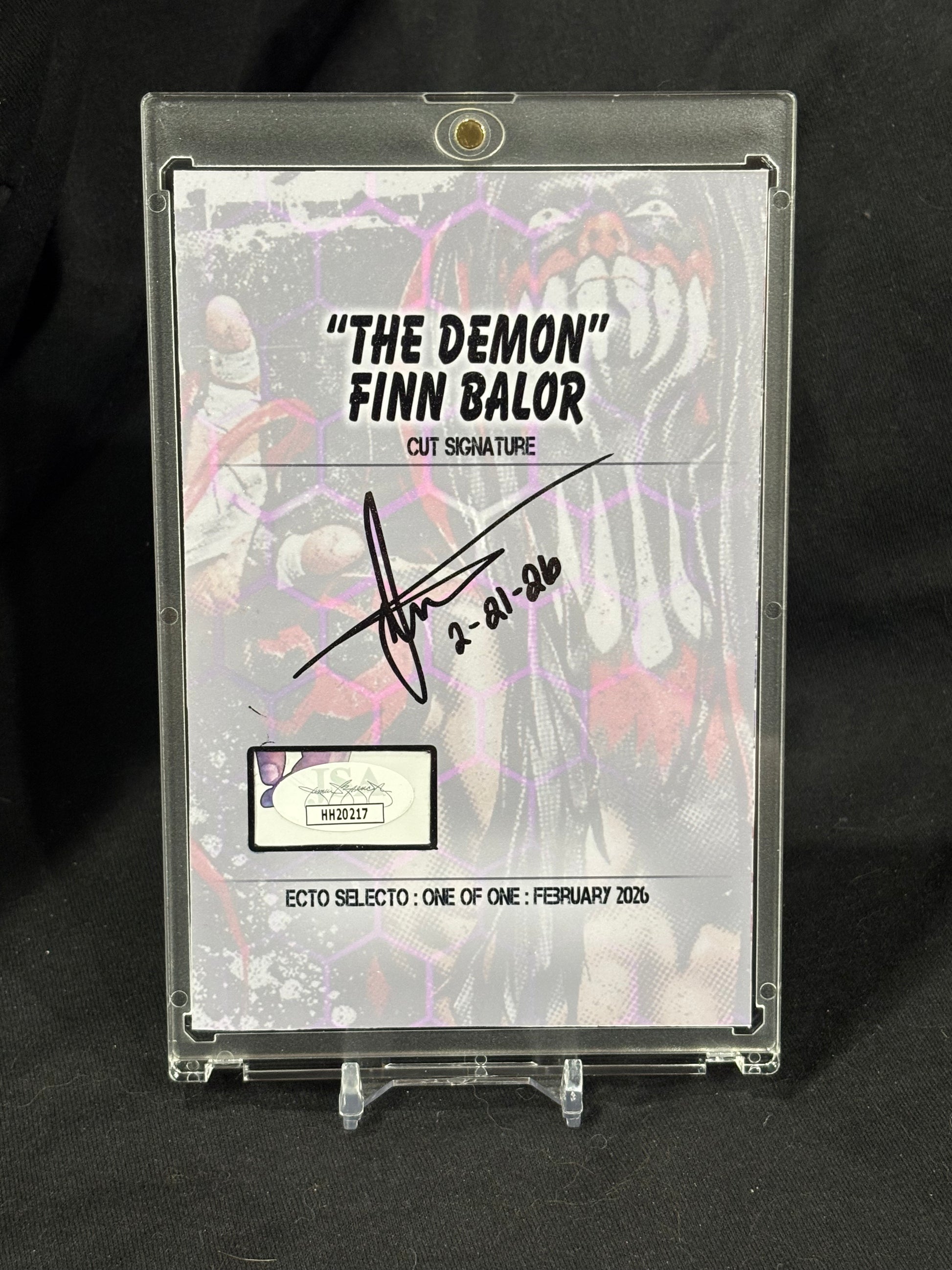 This is a one-of-one custom 4×6 cut signature art card featuring WWE superstar Finn Bálor in his iconic “Demon” persona. The piece is built in Ecto Selecto’s art-forward signature format, combining original custom artwork with an authentic hand-signed autograph carefully extracted and mounted into the design.