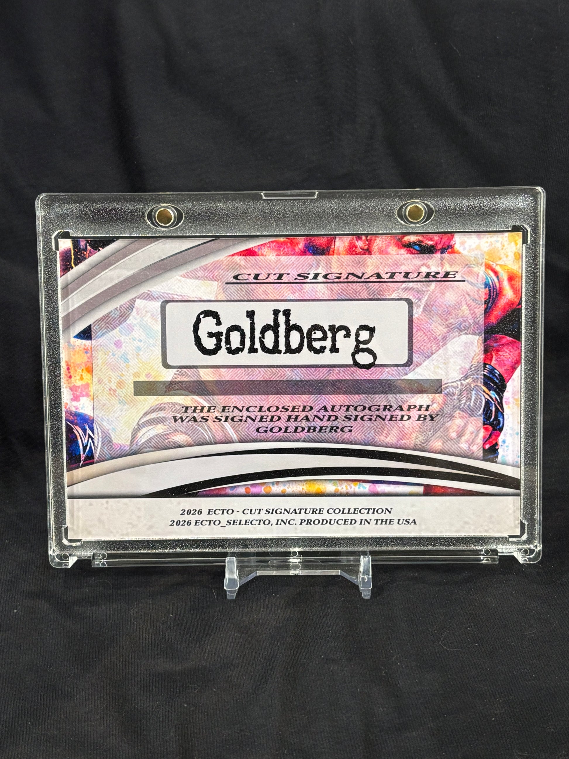 Rather than treating the autograph as a standalone artifact, this work integrates the signature into an art-forward composition that reflects Goldberg’s intensity, physical presence, and era-defining impact. The result is a display-focused collectible designed for long-term presentation, not pack simulation.
