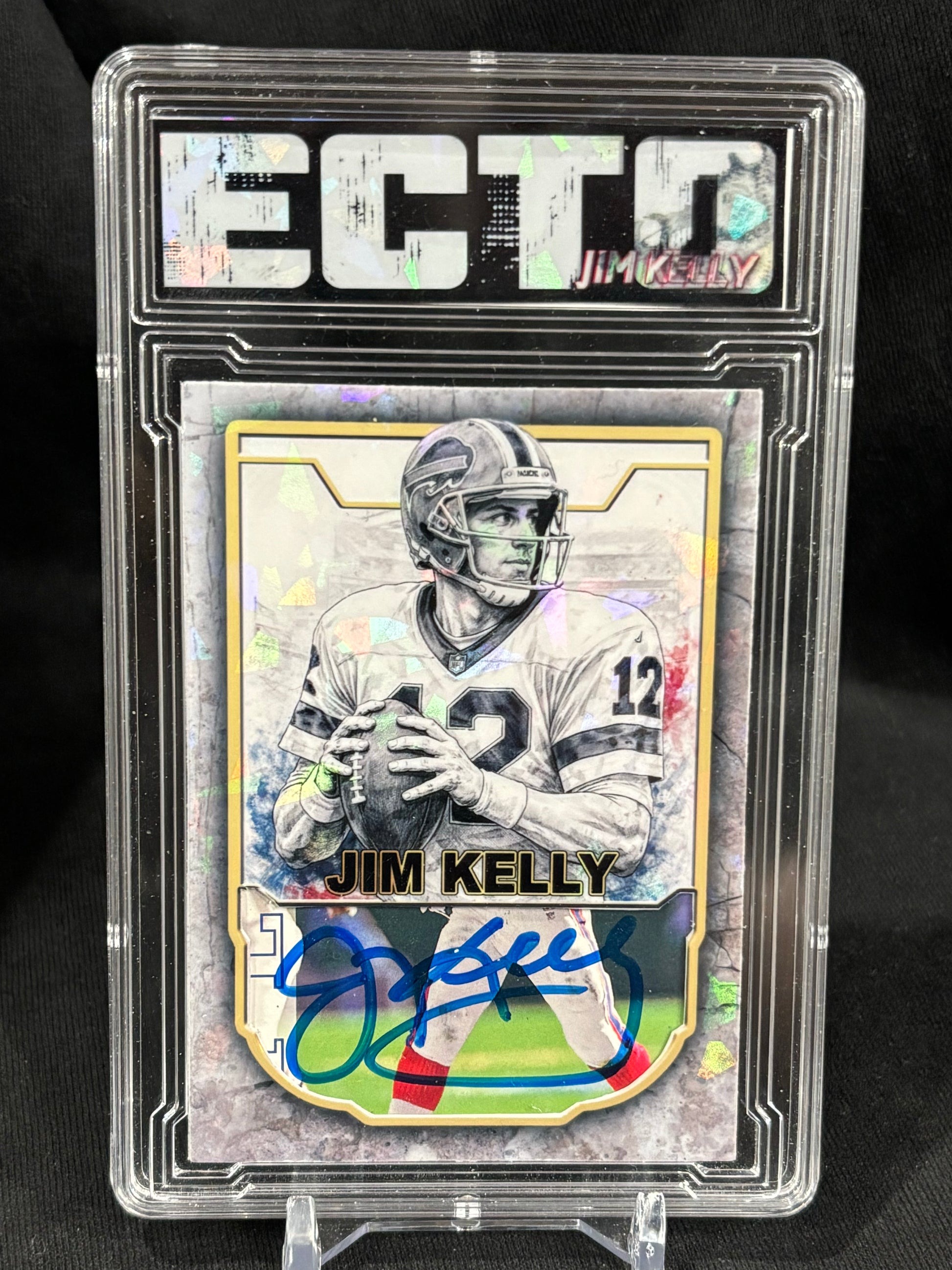 The autograph displayed on the front of this card is an authentic Jim Kelly signature, carefully harvested from an originally signed trading card and professionally integrated into this custom ECTO-designed collectible.