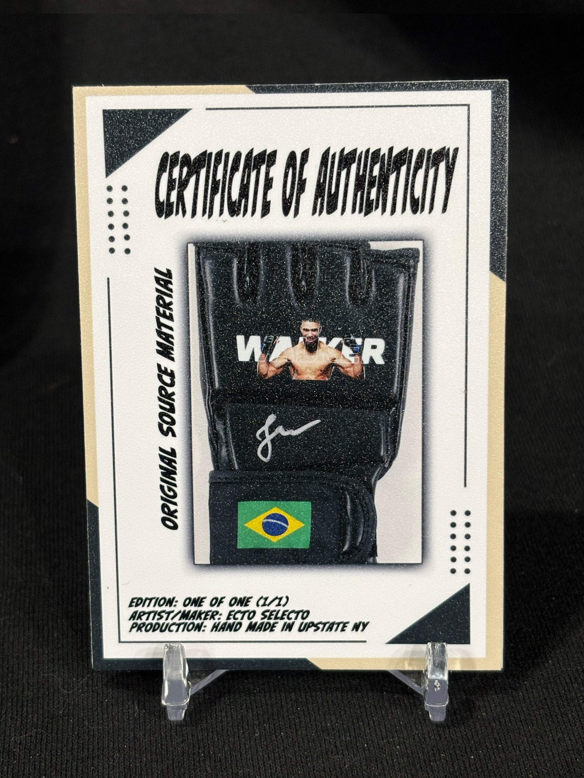 The autograph and relic were sourced from an originally hand-signed MMA glove purchased directly from Pristine Auction. The glove was carefully trimmed to preserve both the autograph and material integrity, then integrated into this custom card design as a unified relic and cut signature presentation.