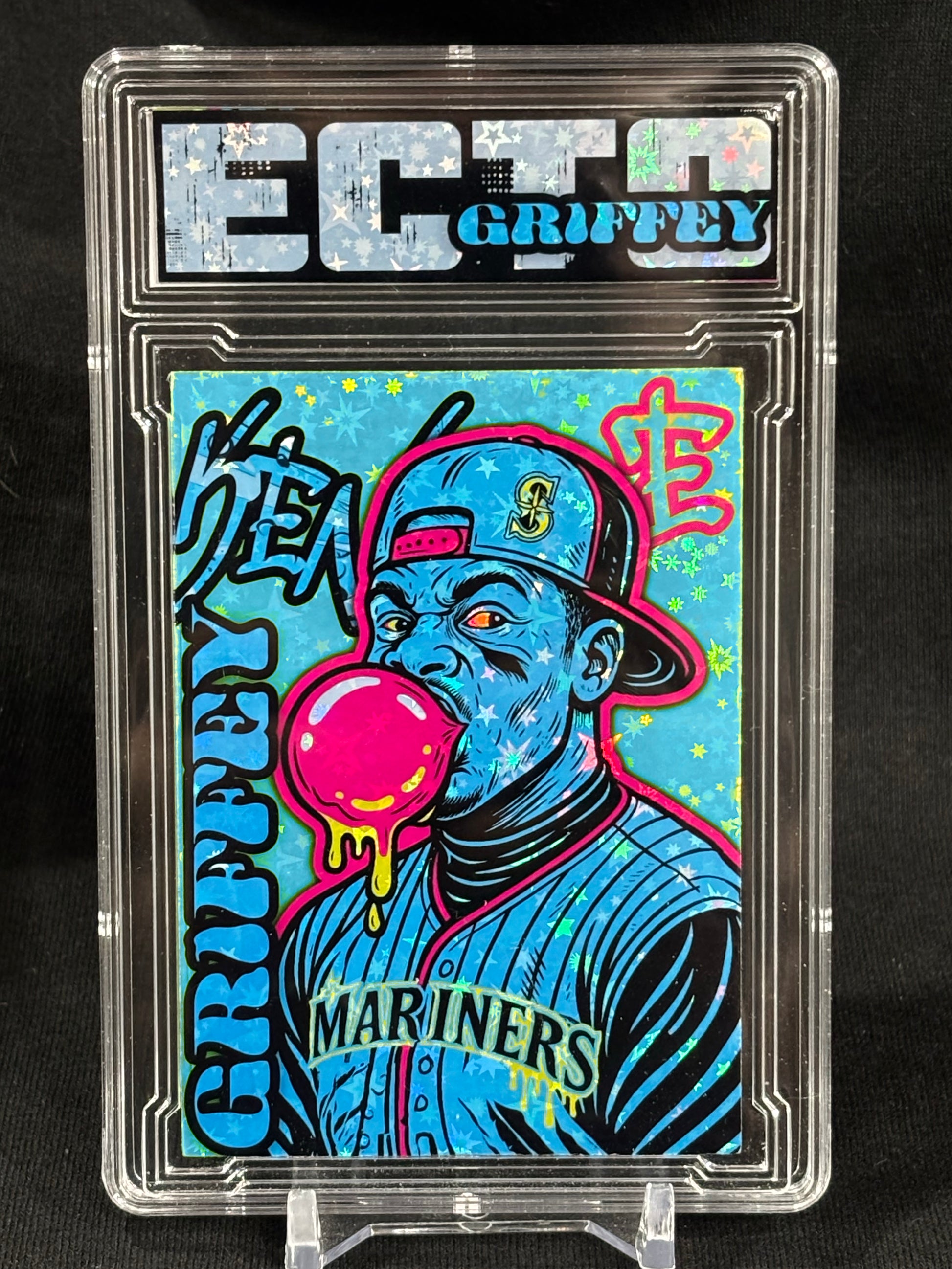 Each card features Griffey blowing a giant dripping bubblegum bubble, surrounded by fluorescent highlights, graffiti textures, and street-art inspired details. Printed on premium holo stock and slabbed in an ECTO custom case, every variation is hand-numbered 1/1 — no duplicates, no reprints.