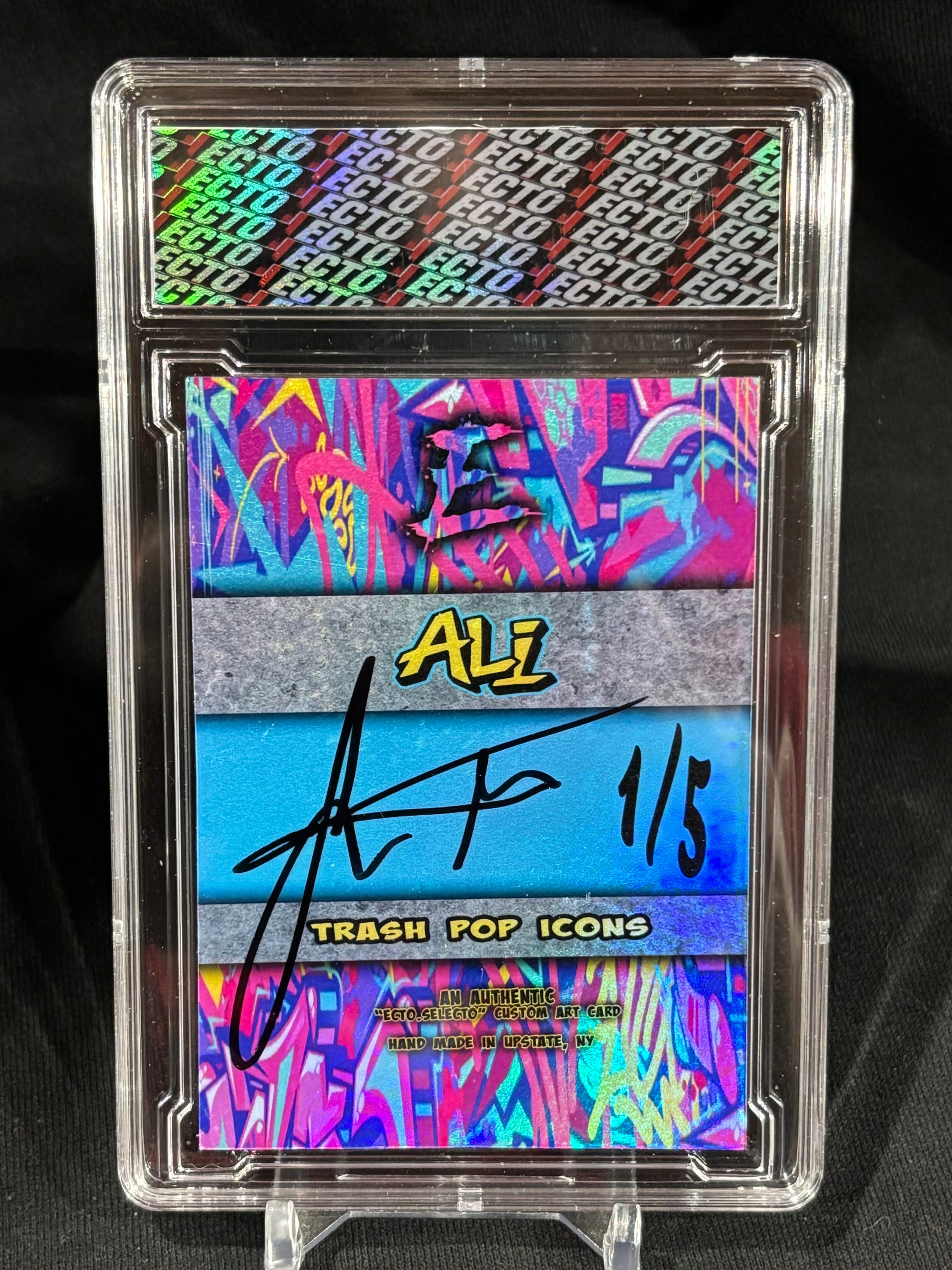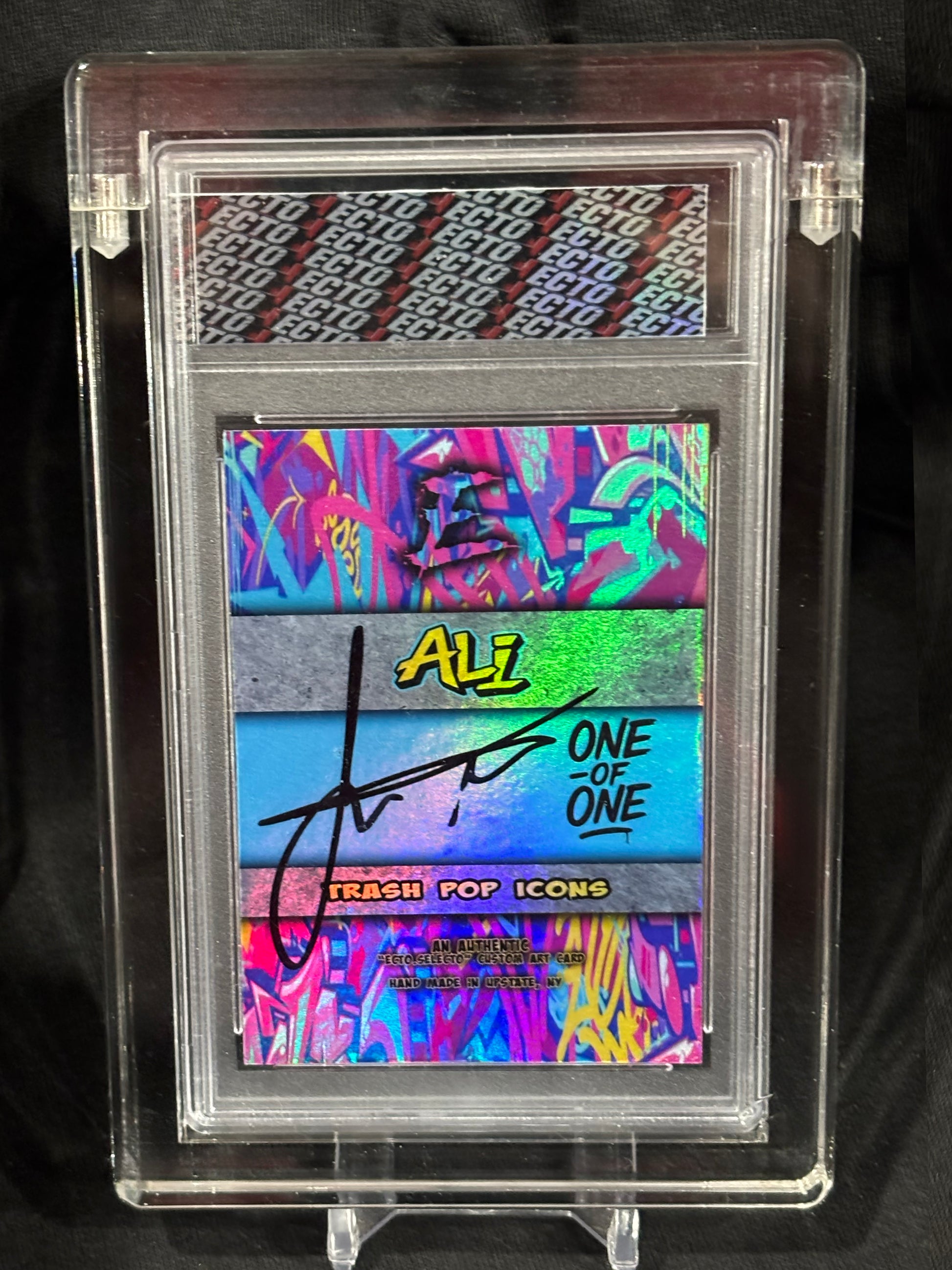 Step into the ring with the legend. This Muhammad Ali Trash Pop Icons card combines bold underground art with street-inspired neon chaos — a tribute to the greatest of all time. Featuring Ali in a fierce Trash Pop style with butterflies and bees circling, the piece celebrates the “Float like a butterfly, sting like a bee” mantra in unforgettable fashion.