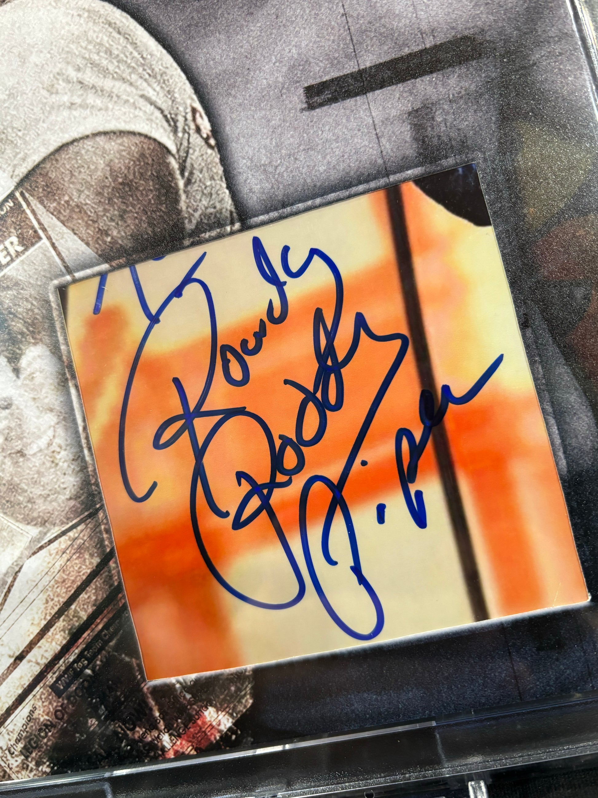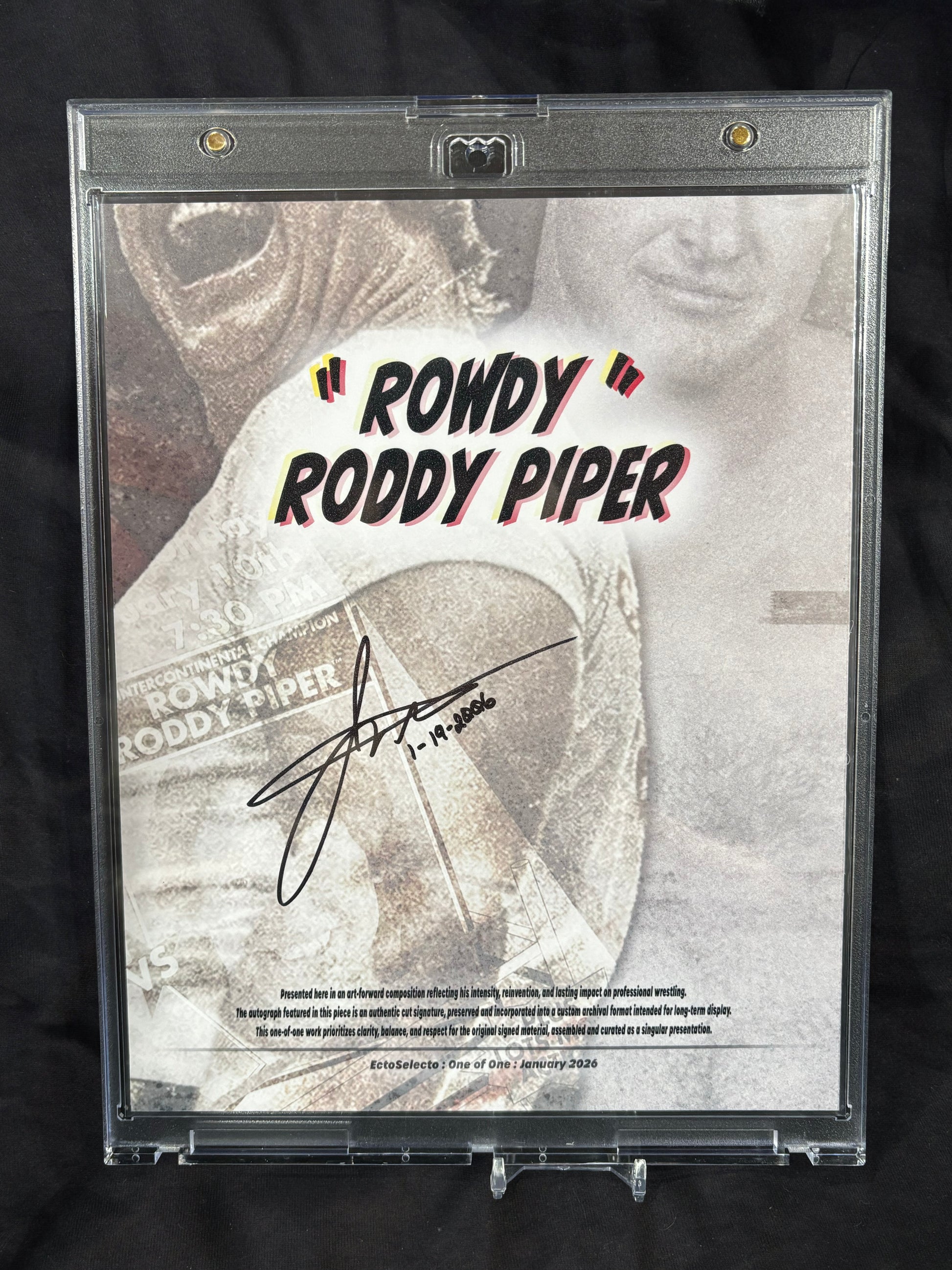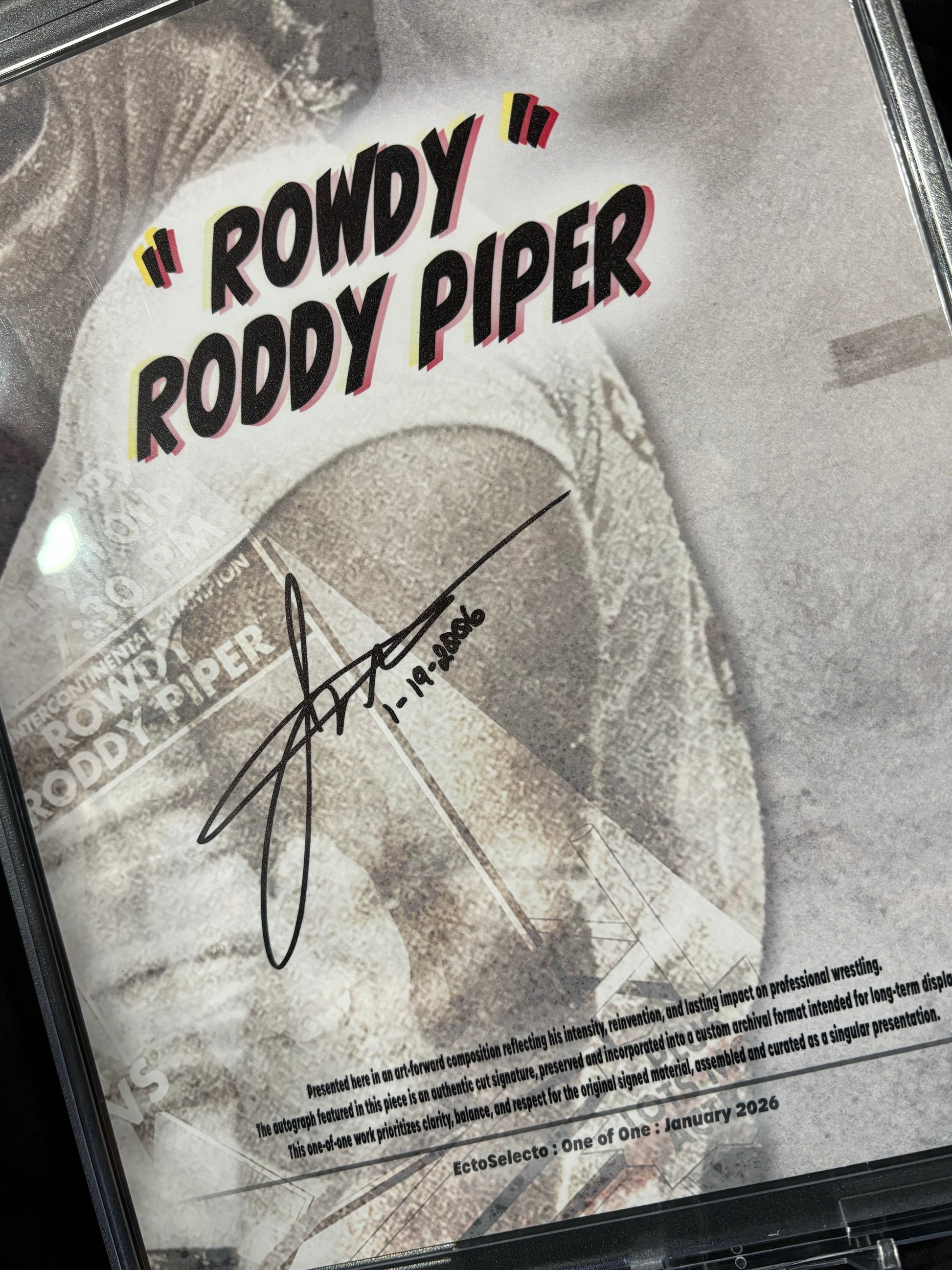 This one-of-one art piece features an authentic Rowdy Roddy Piper cut signature, preserved from an original signed 8×10 photograph and incorporated into a custom, art-forward composition designed for permanent display.