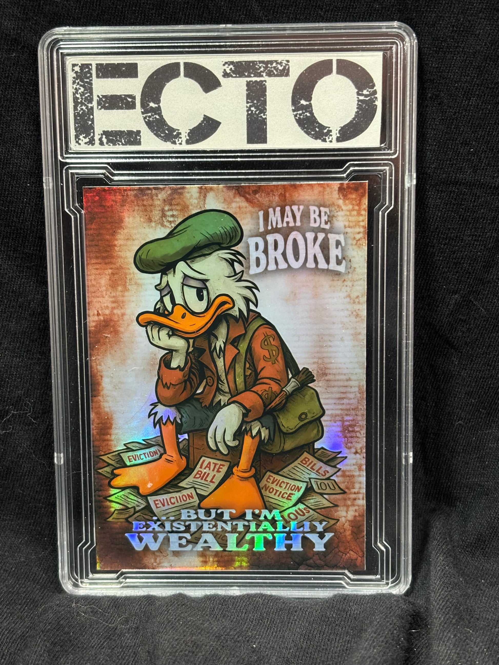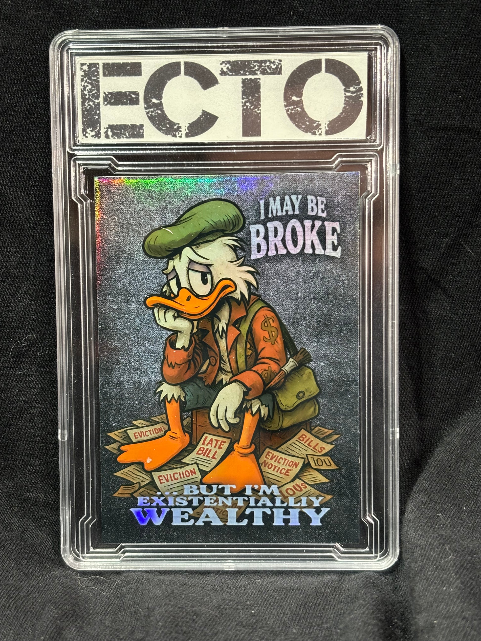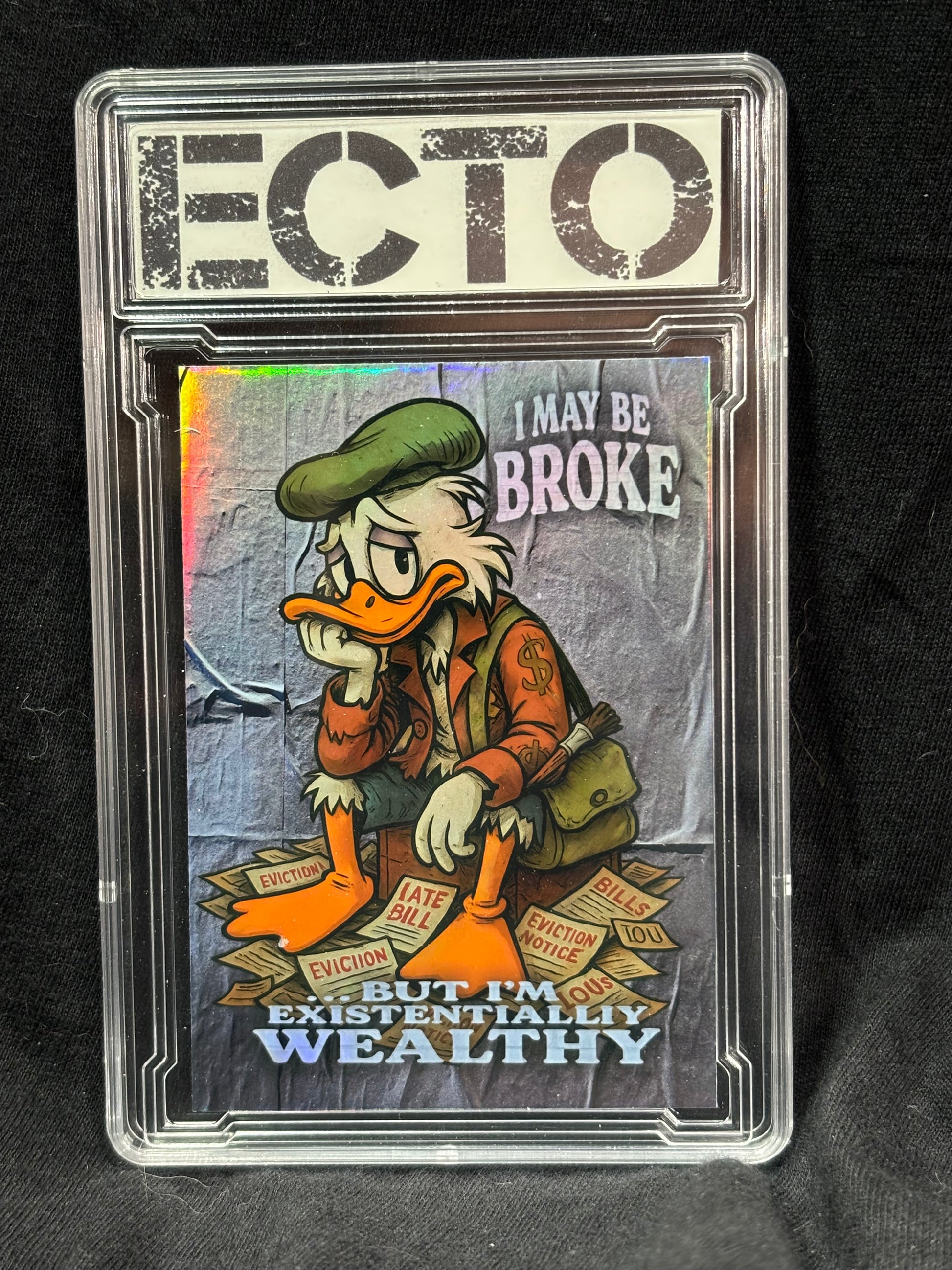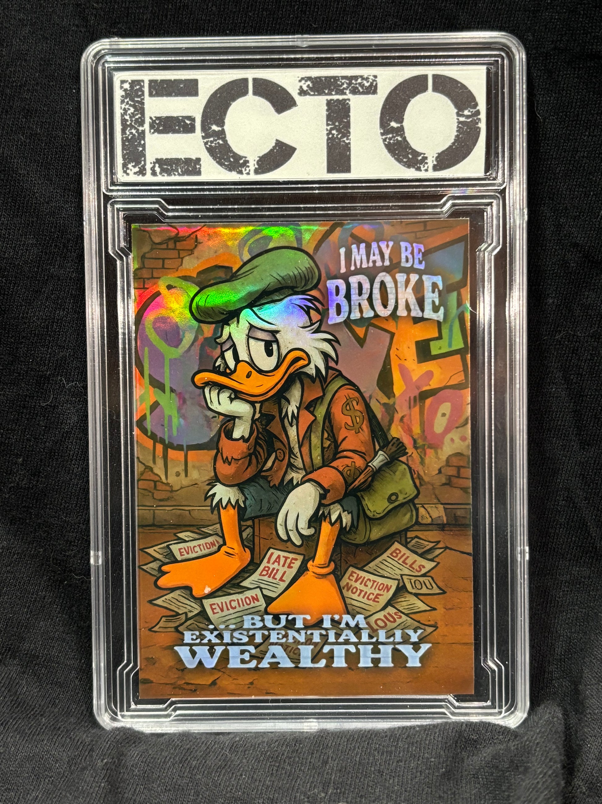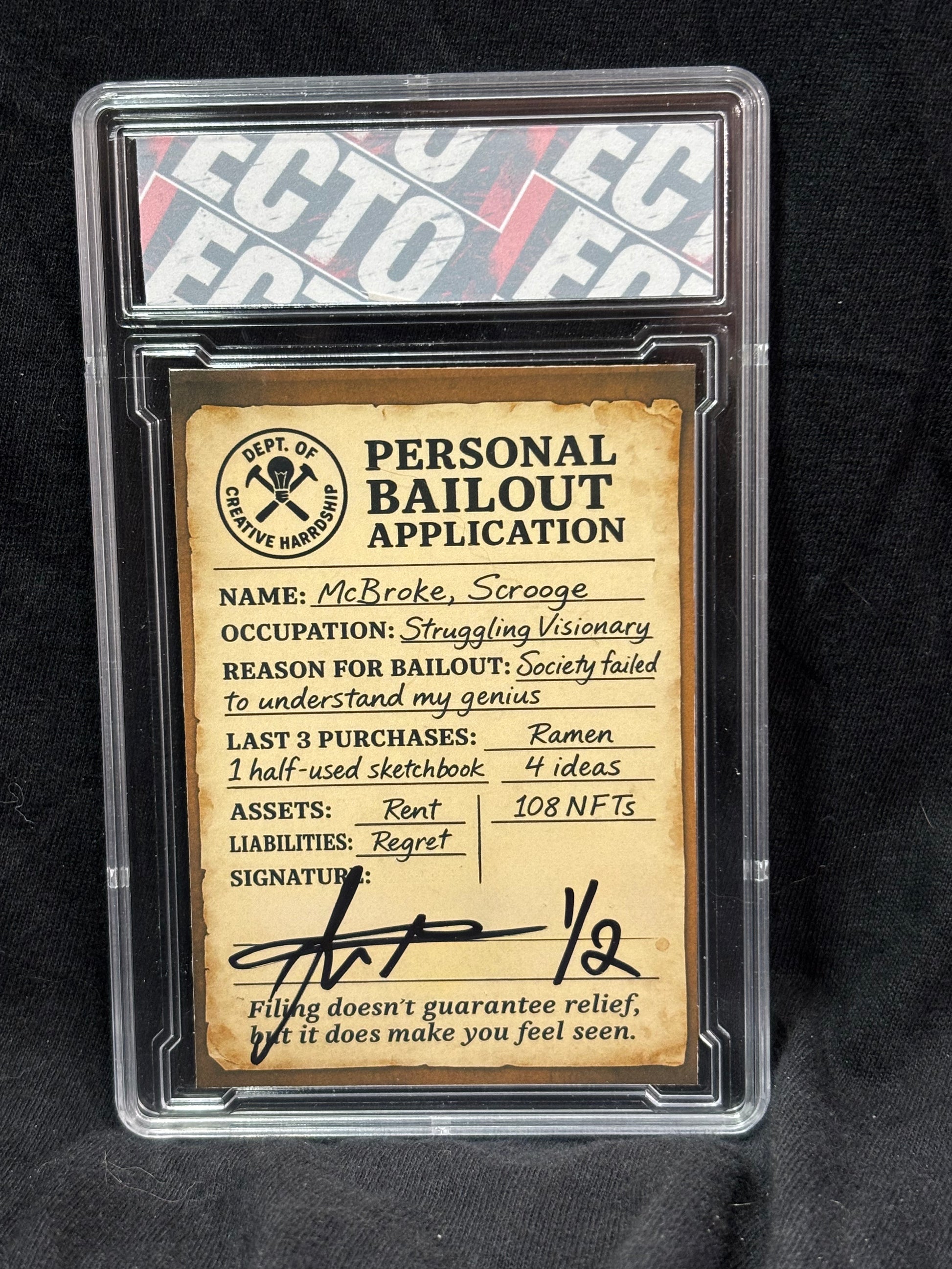 This satirical art card is a tongue-in-cheek tribute to the modern creative struggle, featuring a weary duck contemplating life, bills, and existential wealth. Each card comes with a unique Personal Bailout Application on the back—hand-signed and numbered /2.