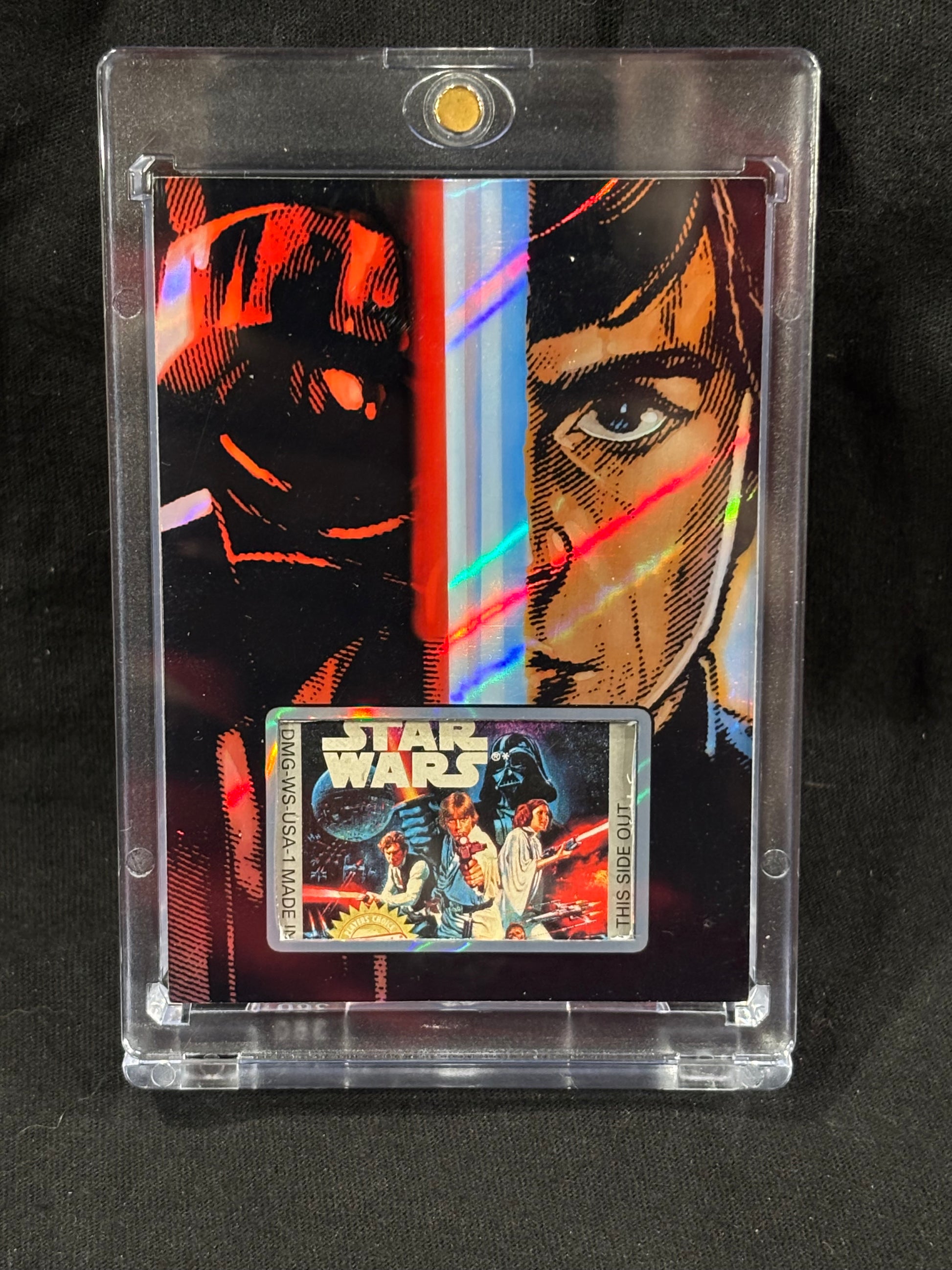 A one-of-a-kind Star Wars collectible! This Ecto custom card brings the clash of Vader vs. Luke to life with striking artwork and a unique embedded relic.