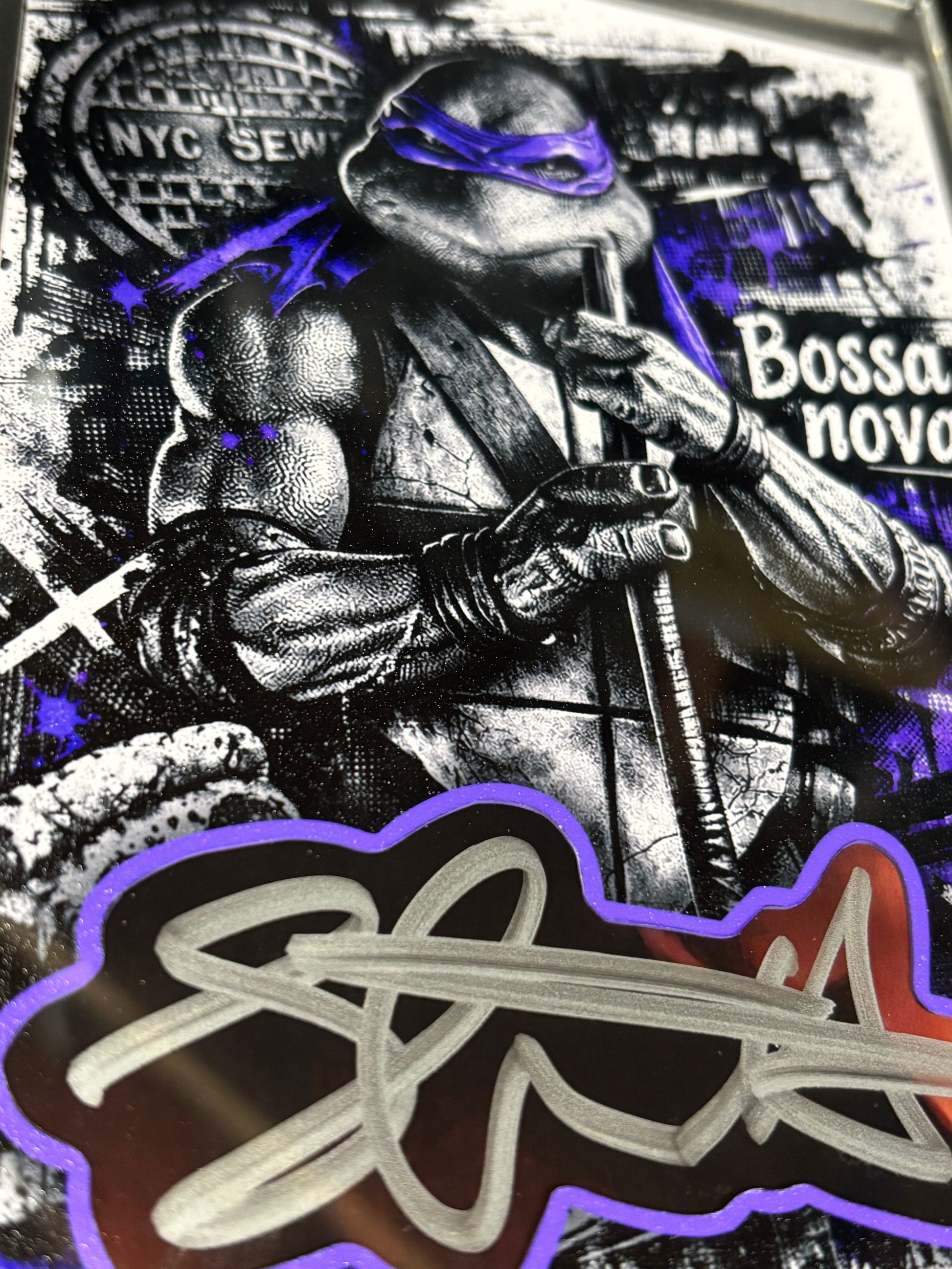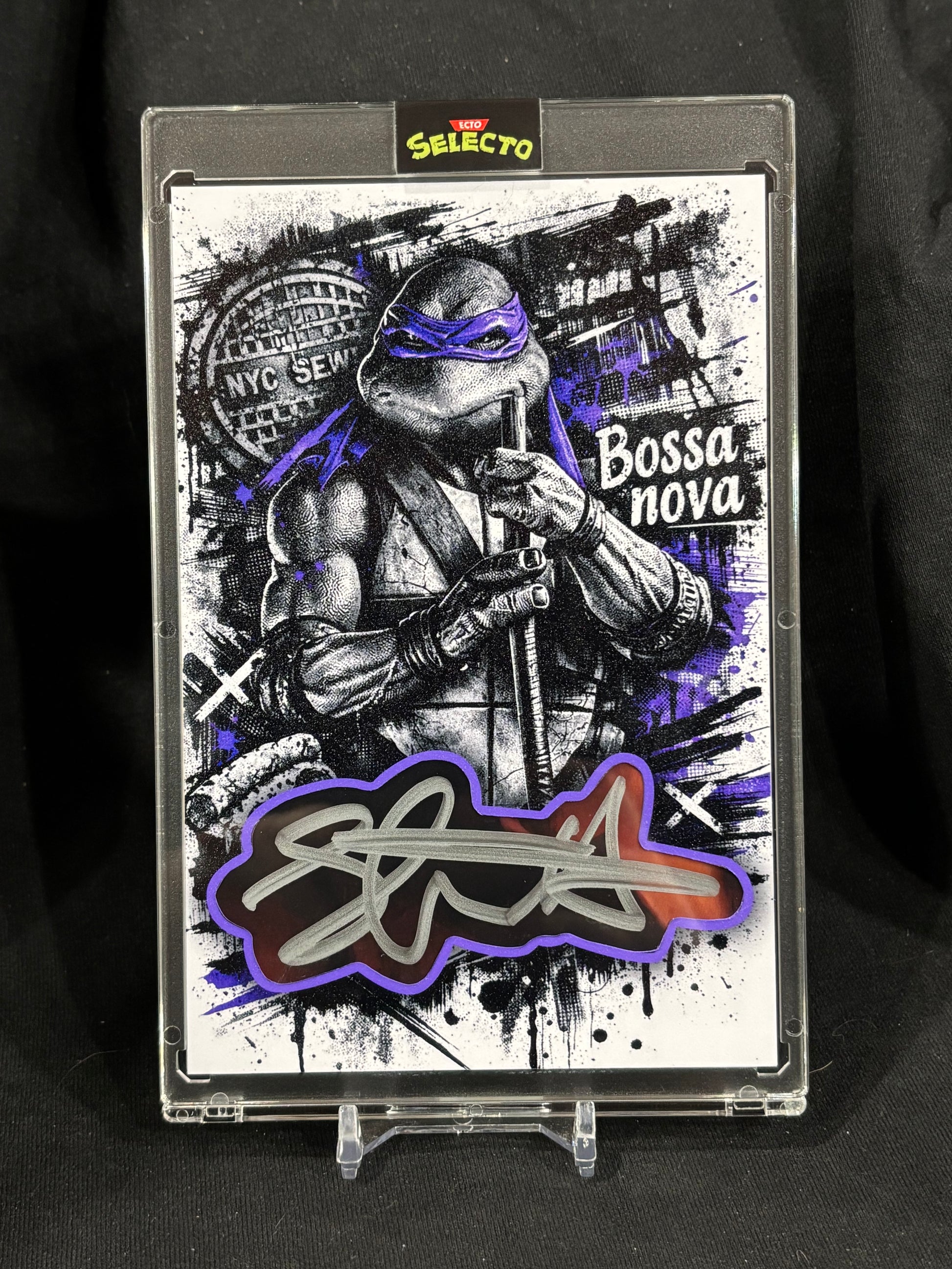 The autograph has been carefully extracted from an original signed source and preserved within a custom-designed 4×6 art card, created exclusively for this one-of-one EctoSelecto presentation. The artwork is rendered in a high-contrast street-art style with signature purple accents, paying homage to Donatello’s iconic look while maintaining a museum-style aesthetic.