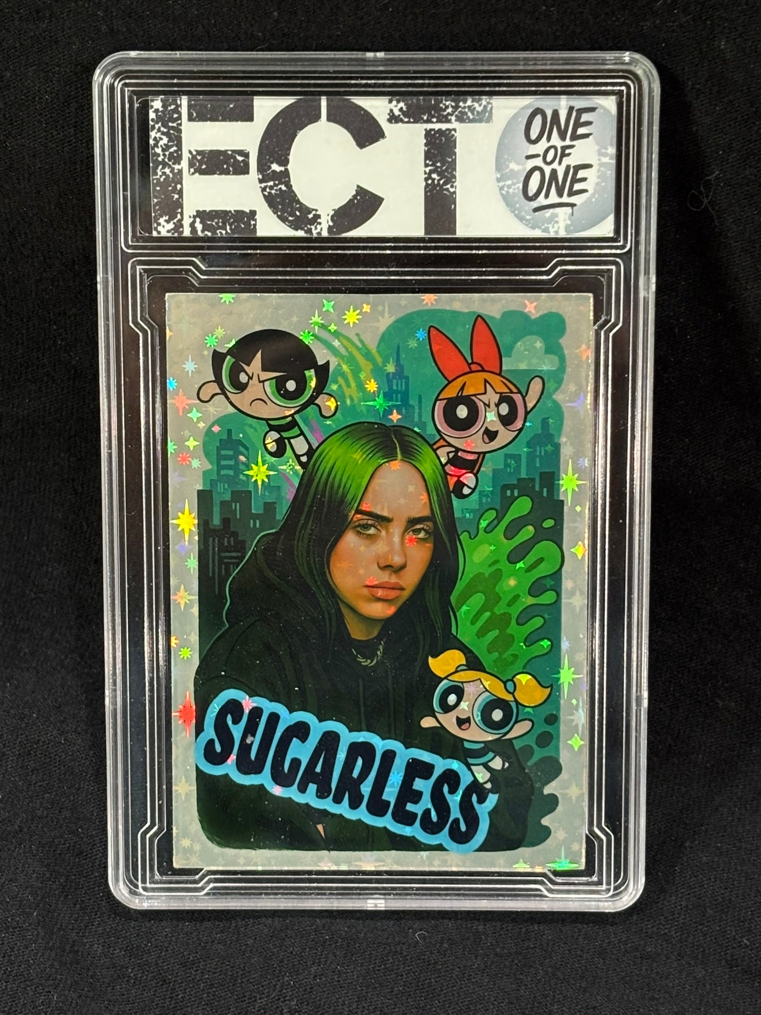 Part of the Unreal Series, Sugarless is a one-of-a-kind mashup featuring Billie Eilish with the iconic Powerpuff Girls in a bold, vibrant design. Each variation is completely unique and produced as a 1/1, sealed in an acrylic slab with an official Ecto 1/1 label, and signed and numbered on the back by the artist.