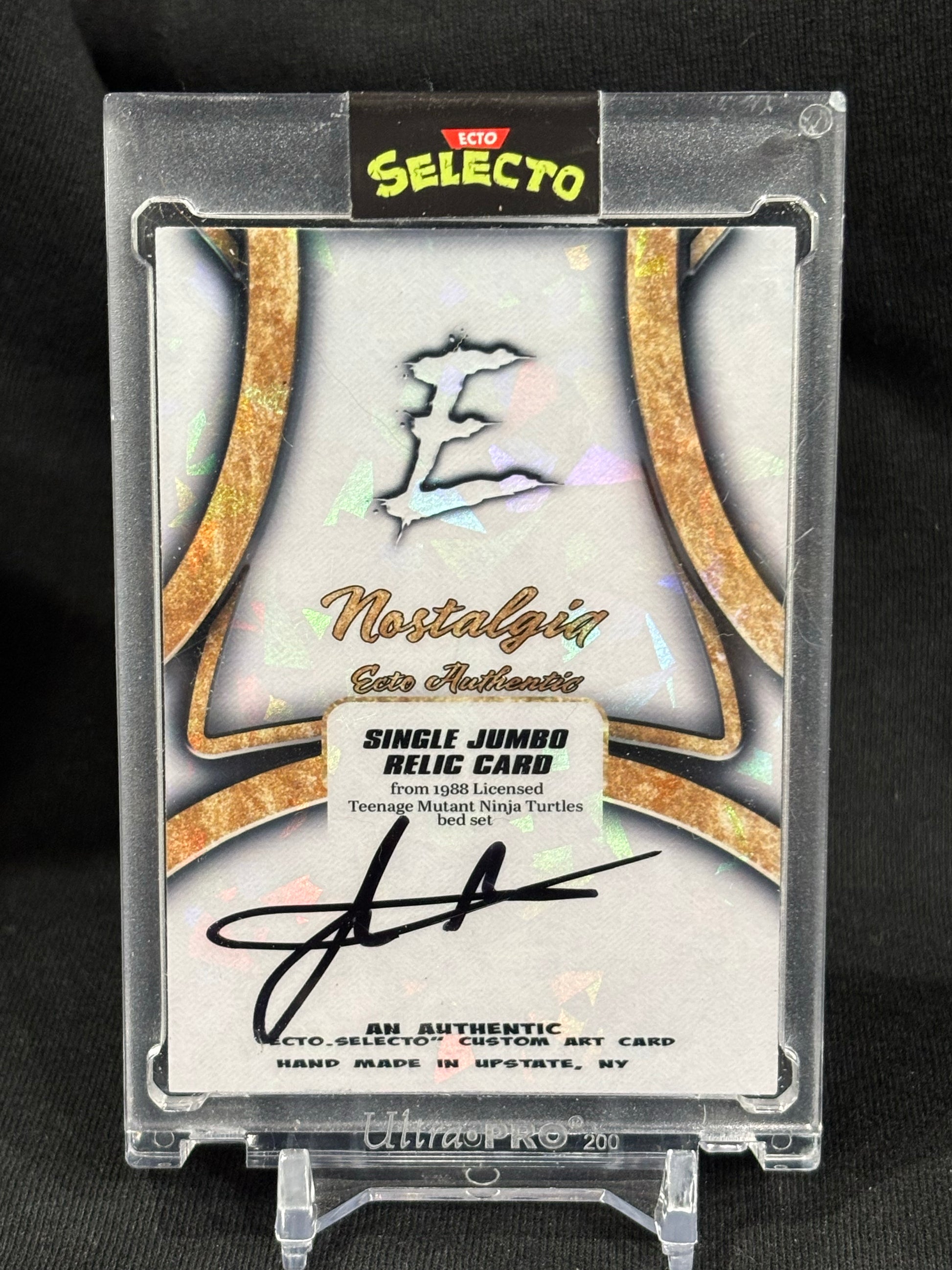 Each card fuses the clean, premium aesthetic of a Panini Flawless-style set with a slice of true 1980s history. Every relic swatch is cut from an original vintage TMNT bed sheet — the same one used across Ecto Selecto’s relic releases — giving each piece an authentic connection to the Saturday-morning memories that started it all.
