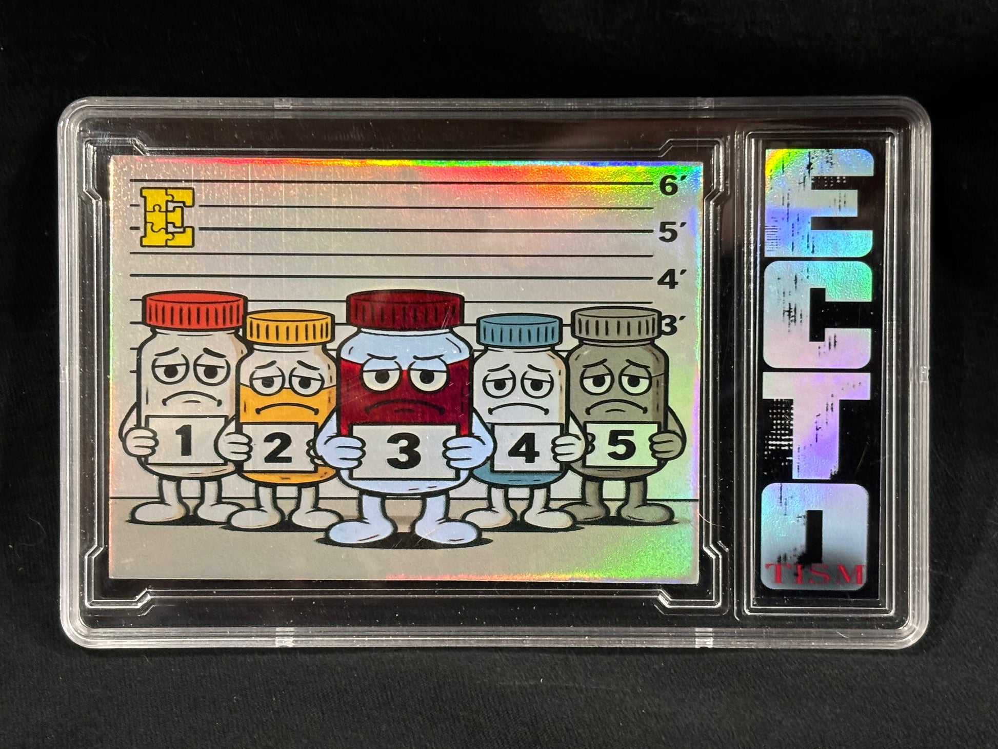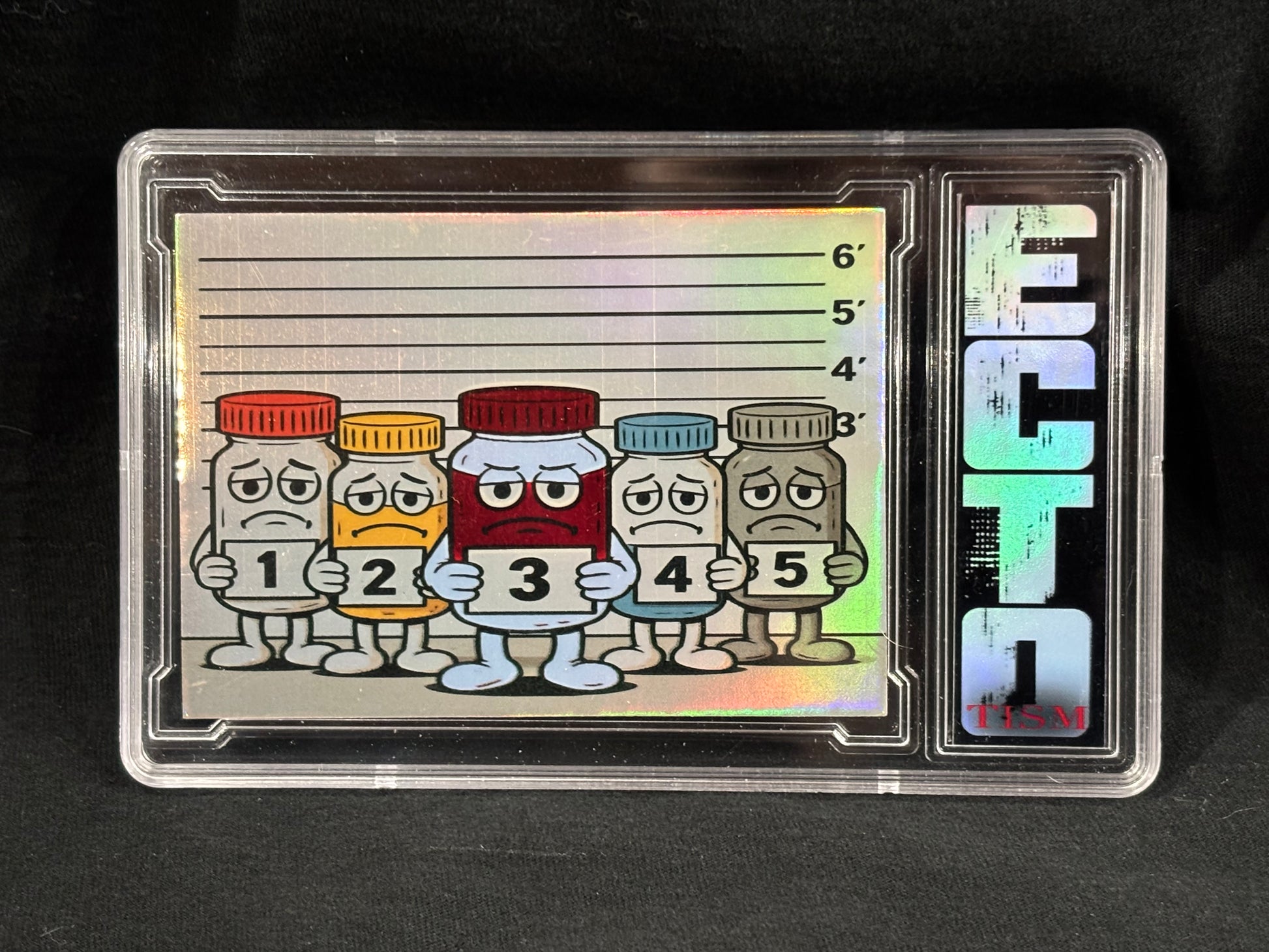 Line ‘em up. This parody set reimagines The Usual Suspects with a Tism twist—anthropomorphic pill bottles caught in a police lineup. Bold, tongue-in-cheek, and perfectly unhinged, this collection brings together satire and collectible art in true Ecto fashion.