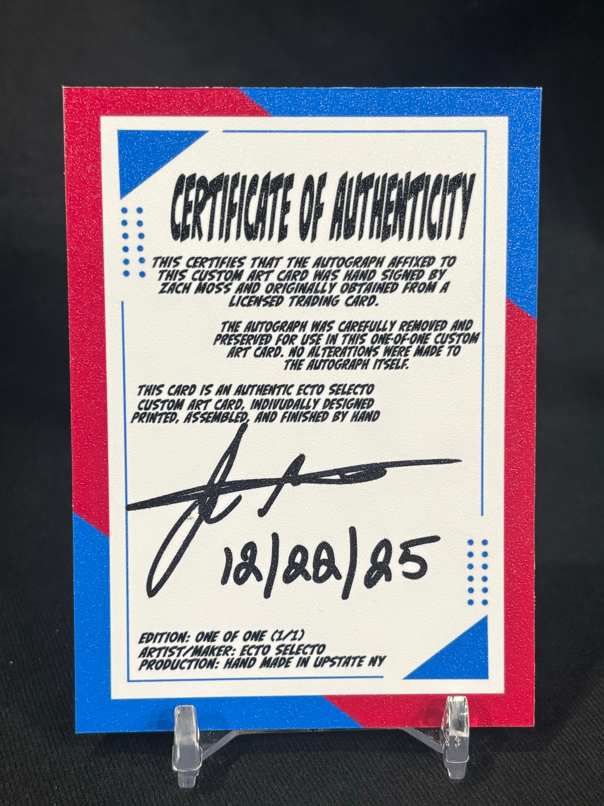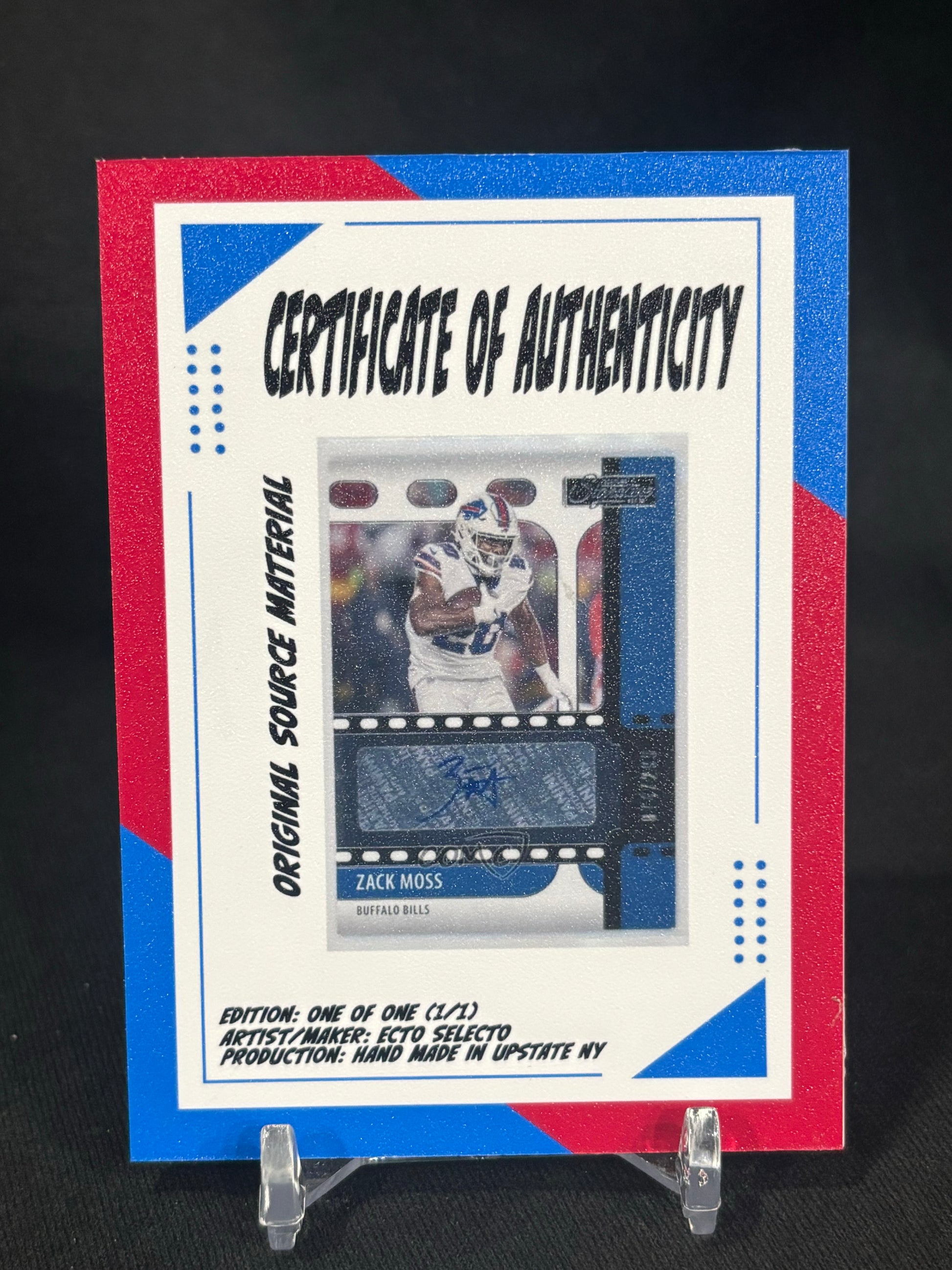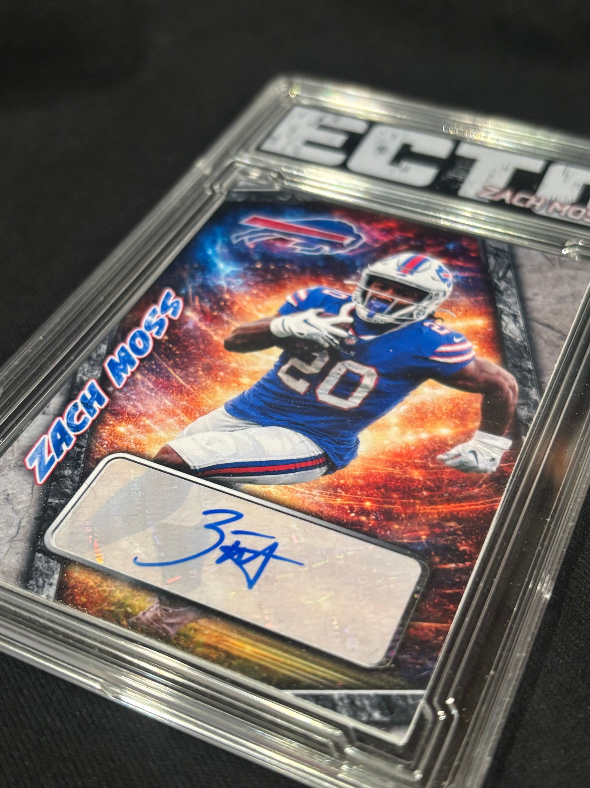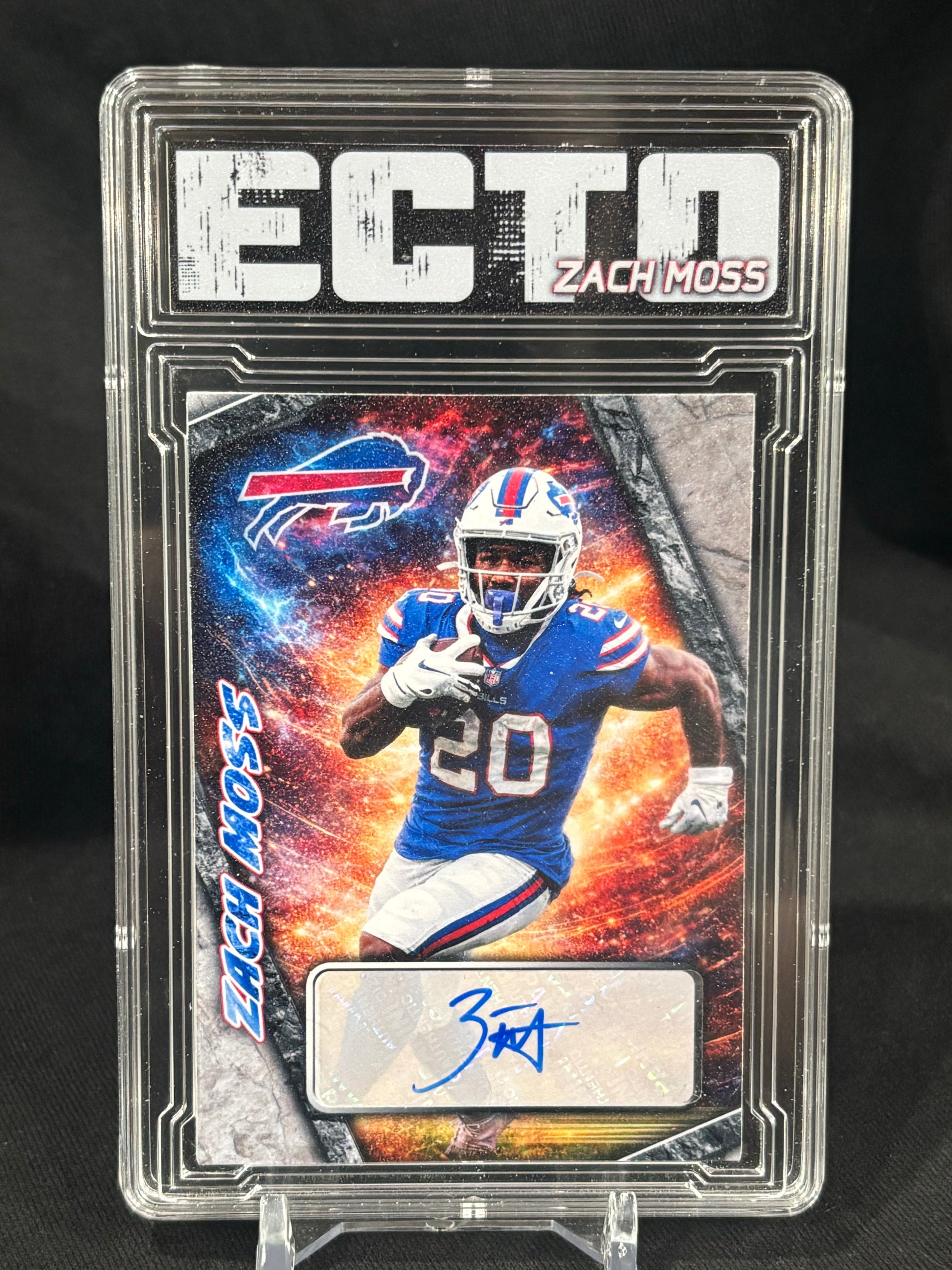 This Zach Moss 1/1 Cut Signature card is an art-forward custom collectible produced by Ecto Selecto, designed to preserve and elevate an authentic athlete autograph into a display-ready format that factory cards cannot offer.